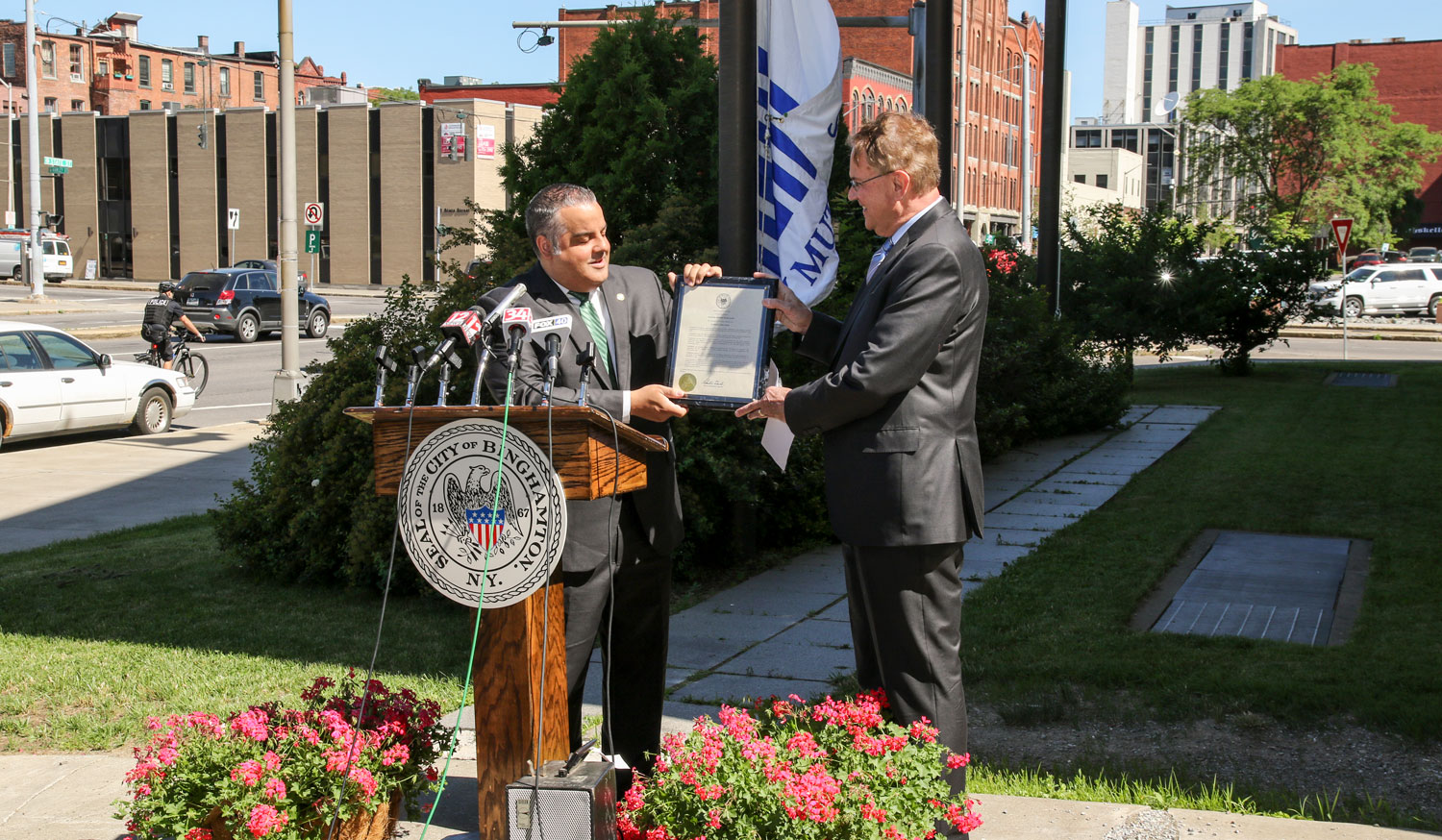 The proclamation recognized Security Mutual for its ongoing commitment to the community, a commitment that is now in full bloom—literally! Thanks to a joint effort between the City of Binghamton and Security Mutual, large baskets of vibrant red geraniums are adorning the lampposts throughout downtown, adding a splash of summertime color for the enjoyment of residents and visitors alike.