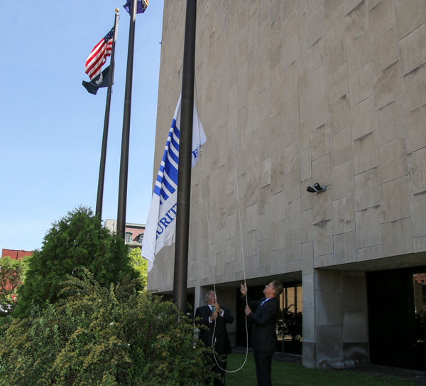 Binghamton Mayor Richard David (l) and Security Mutual Life Executive Vice President and Chief Financial Officer Pete B. Pheffer raise Security Mutual’s corporate flag over Binghamton City Hall.