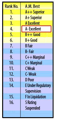 *A.M. Best rating is current as of the date of publication. Ratings reflect a rating agencyās opinion of a companyās financial strength and ability to meet its obligations to its policyholders. A rating is not a recommendation of a company or any specific policy form. A.M. BestāsāA-ā (Excellent) rating is the fourth highest on a 16-step rating scale.Ratings are subject to change.